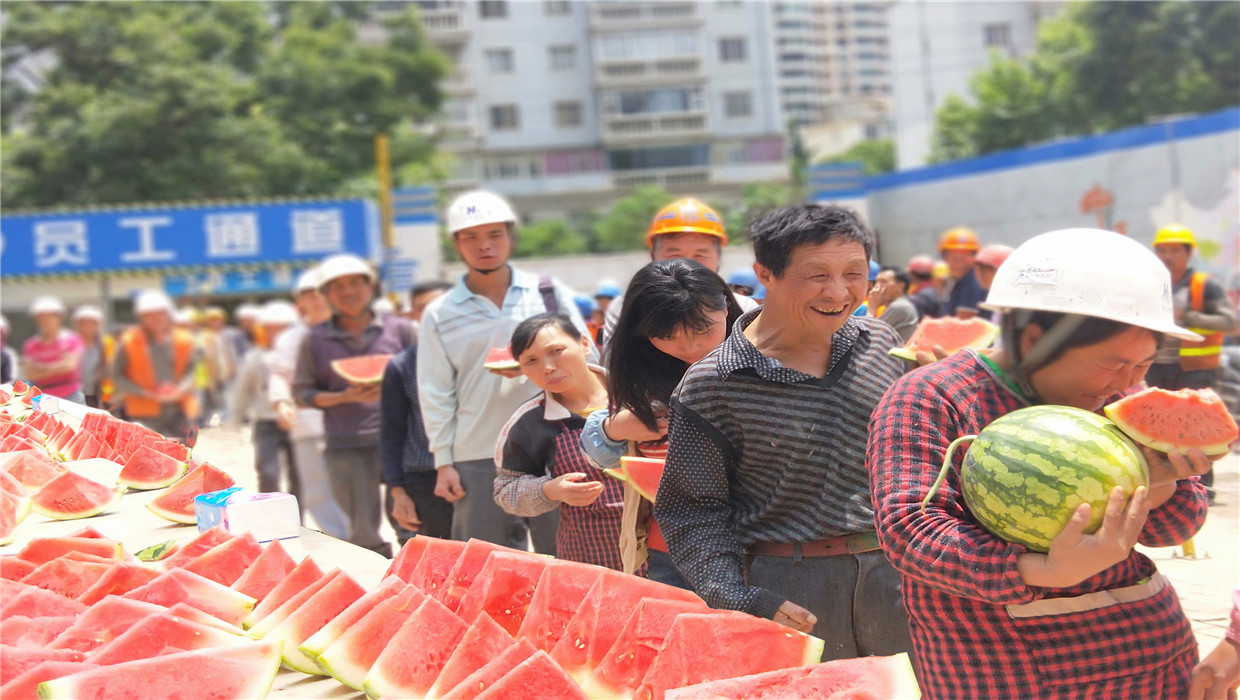 炎熱的夏天,美味爽口的西瓜凝聚著中天人的愛,為辛勤的勞動者送上夏日的清涼